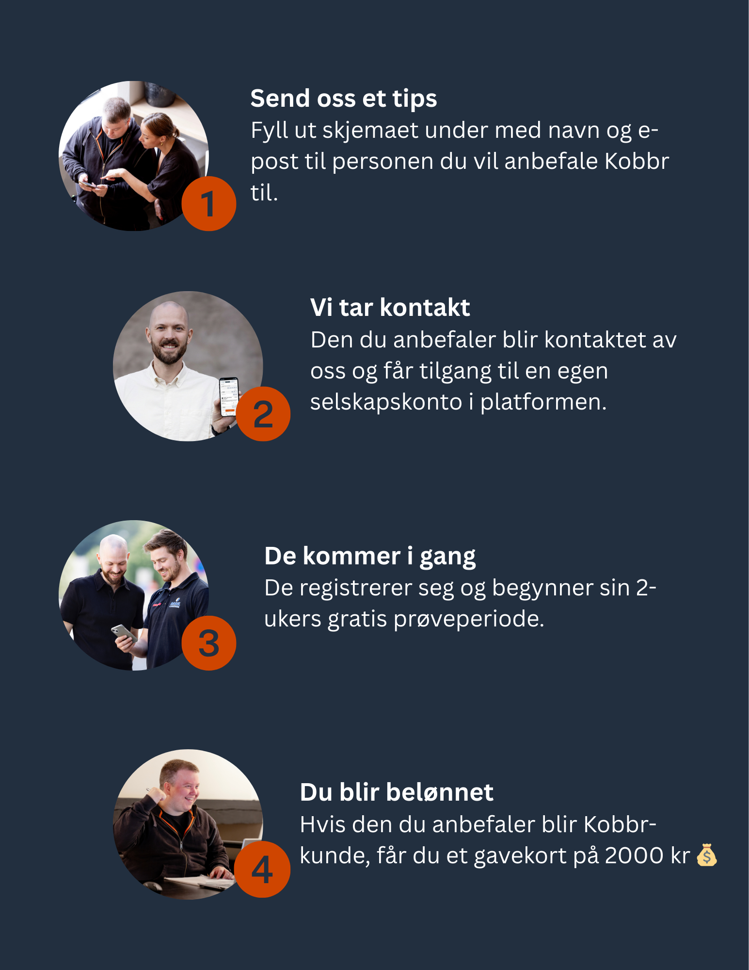 Tips: Du har mye større sjanse for å lykkes dersom personen du refererer er klar over det før du sender inn skjemaet. Vi anbefaler å slå på tråden og gi beskjed at de vil bli kontaktet for en gratis prøveperiode.